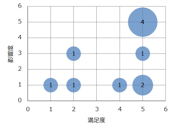 ある製品や道具の満足度と製品購入や道具を導入したことによる生産性への影響度を測定するアンケートをとったとします。